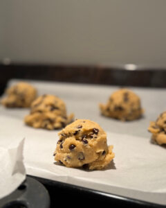 Schep met een ijslepel bolletjes van het koekdeeg op de bakplaat. Zorg voor voldoende tussenruimte, de koeken lopen uit.- Bak de chocolate chip cookies in het midden van de oven in 10 – 12 minuten gaar.