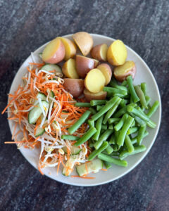 Leg de wortel, komkommer, taugé en bosui bij de aardappelen en sperziebonen op het bord.- Schenk de pindasaus over de groenten en verdeel de eieren over het bord.