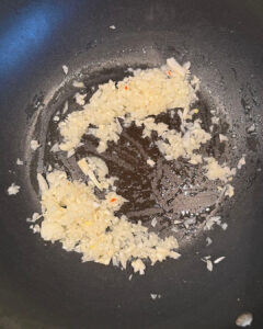 • Verhit een beetje olie in een wok en fruit hierin de ui en knoflook tot de ui glazig ziet.