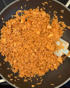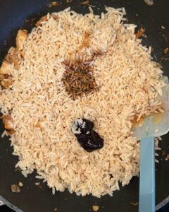 • Doe vervolgens de gekookte rijst in de pan en voeg ook de ketjap manis en trassi toe.