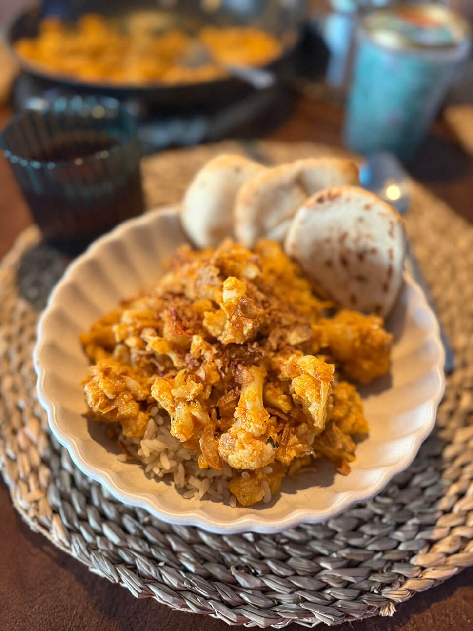 Dinsdag deed ik eigenlijk hetzelfde trucje als zondag: kijken wat er allemaal nog in huis was. Er lag nog een bloemkool in de koelkast en van Patak’s kreeg ik onlangs een pakketje met daarin currysauzen en naan. Ik maakte bloemkoolcurry met tonijn en dat smaakte hartstikke goed.