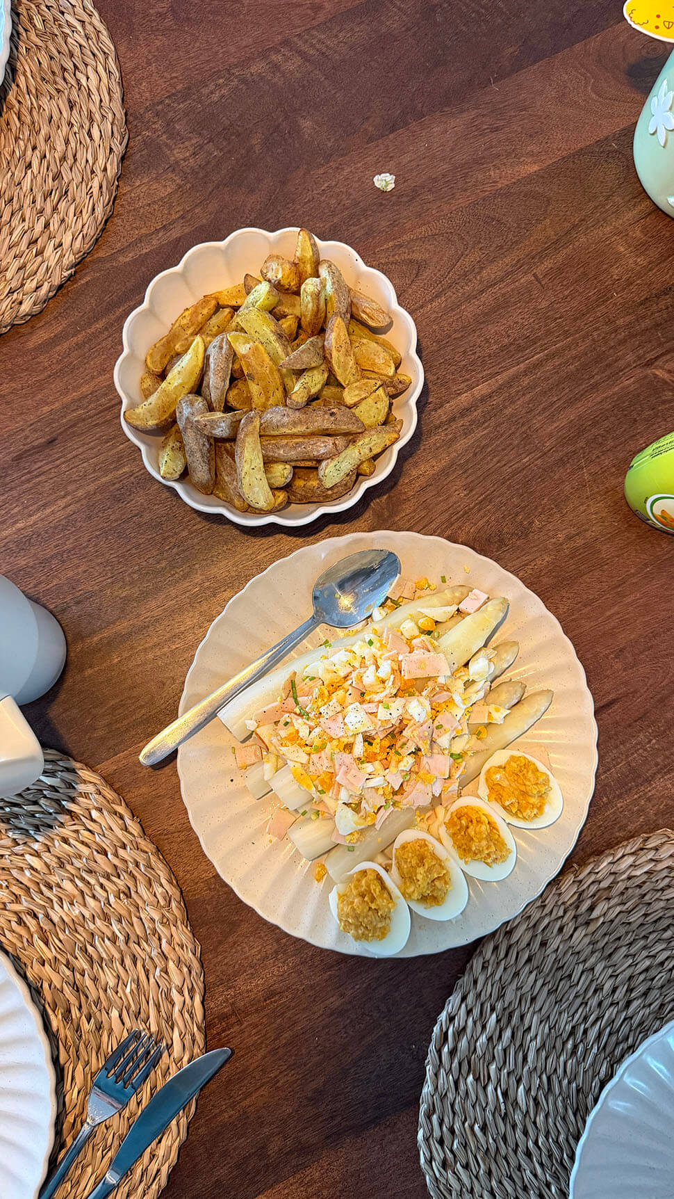 De broekriem ging dus een beetje aan en alles wat ik eet hou ik bij in een app. Gelukkig past er heel veel binnen het schema! Zo aten we maandag witte asperges met gekruide aardappelpartjes uit de Airfryer. Cody vroeg of ik er een paar gevulde eitjes bij wilde maken, vandaar dat die op het bord erbij liggen.