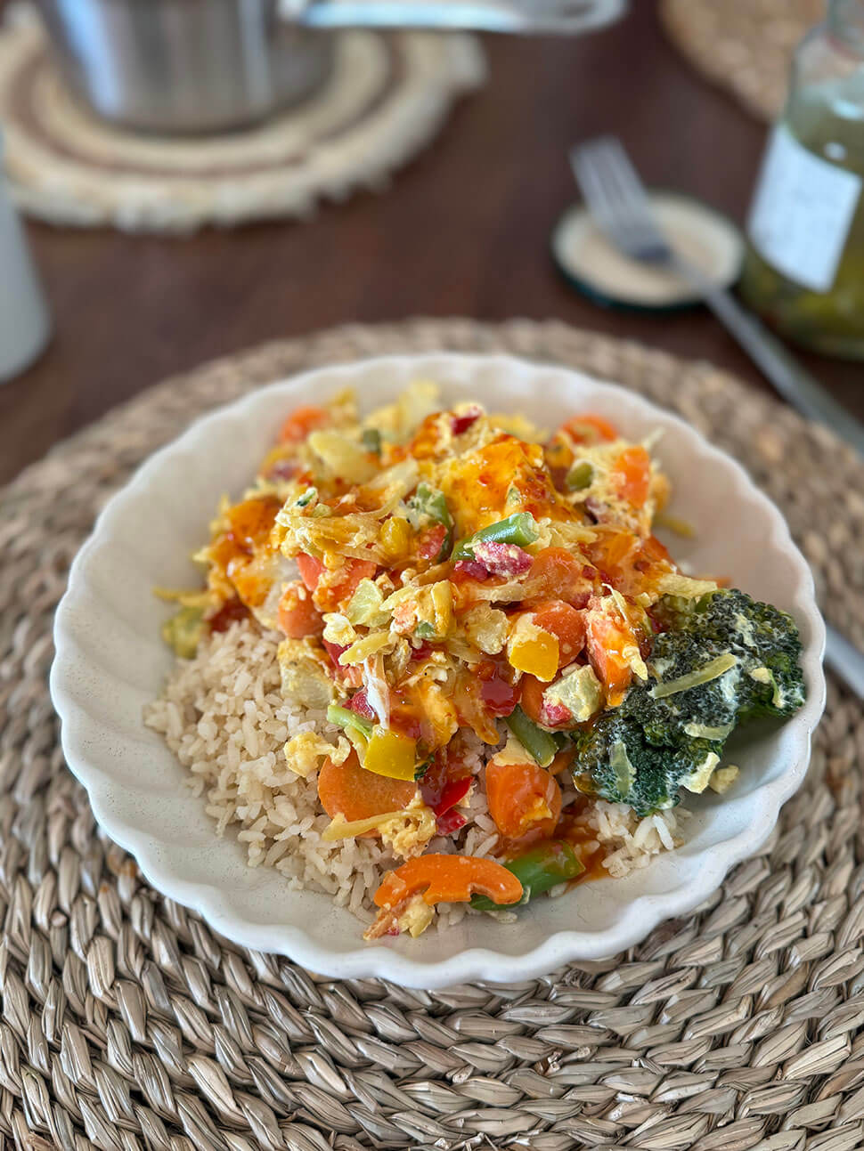 Ik had een kookdag op de planning staan dinsdag en een van de gerechten die ik maakte was babi pangang. Voor het avondeten kwam dit op tafel, maar aangezien ik zelf geen varkensvlees eet, maakte ik voor mezelf iets anders. Een super simpele versie van Foe Yong Hai: groentenmix met roerei en zoete chilisaus erover. Lekker joh.