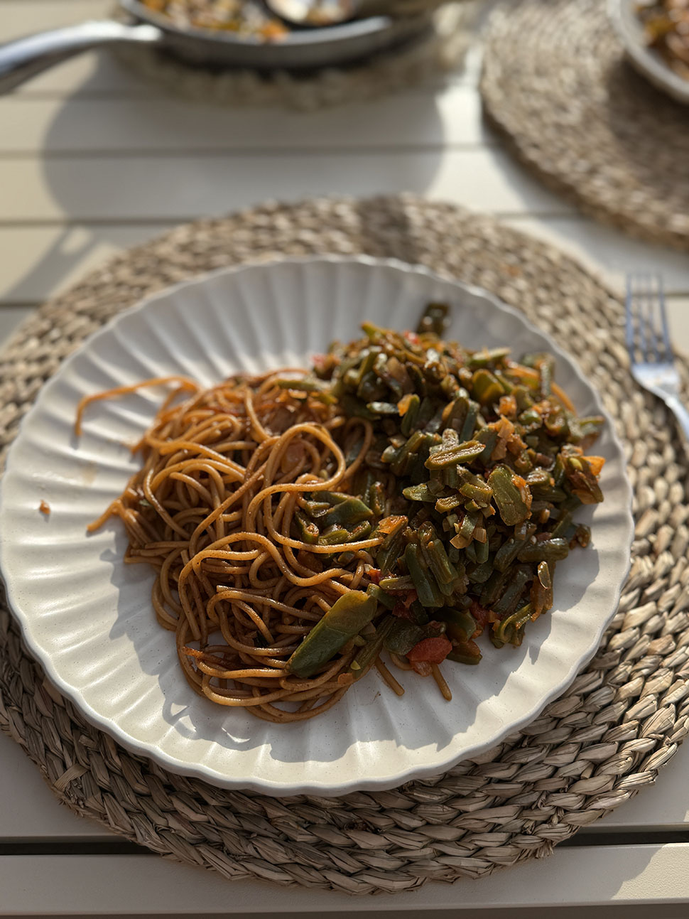 YES, buiten eten! Wat een héérlijkheid is dat weer. Net zo lekker als het eten zelf trouwens. Ik maakte Surinaamse bami (recept komt binnenkort online) met gestoofde snijboontjes.