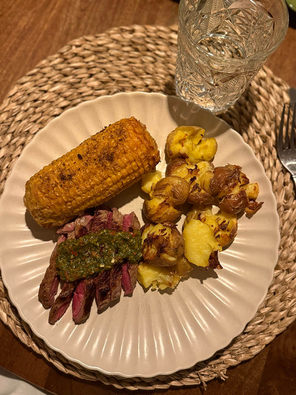 Een AGV’tje deluxe was het op dinsdagavond: smashed potatoes, gegrilde maiskolf en biefstuk met chimichurri – heerlijk! Ik vind chimichurri in combinatie met warme ingrediënten zo lekker.