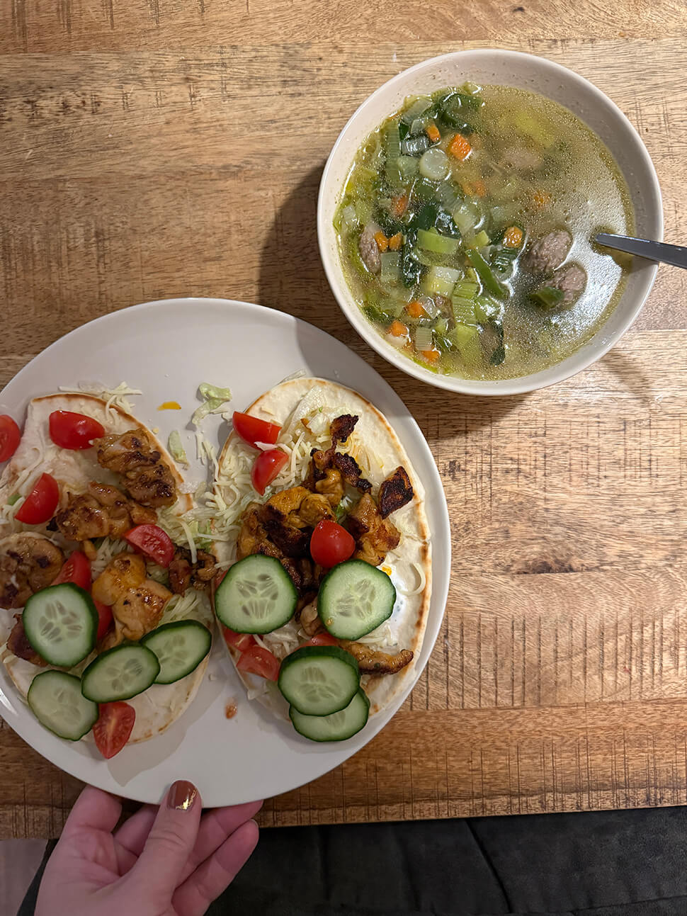 Woensdag waagde ik de gok om naar mijn vriend te rijden en dat was gelukkig prima te doen aan het eind van de middag. We aten simpel: zelfgemaakte groentesoep en flatbreads met kip en lekker veel groenten.