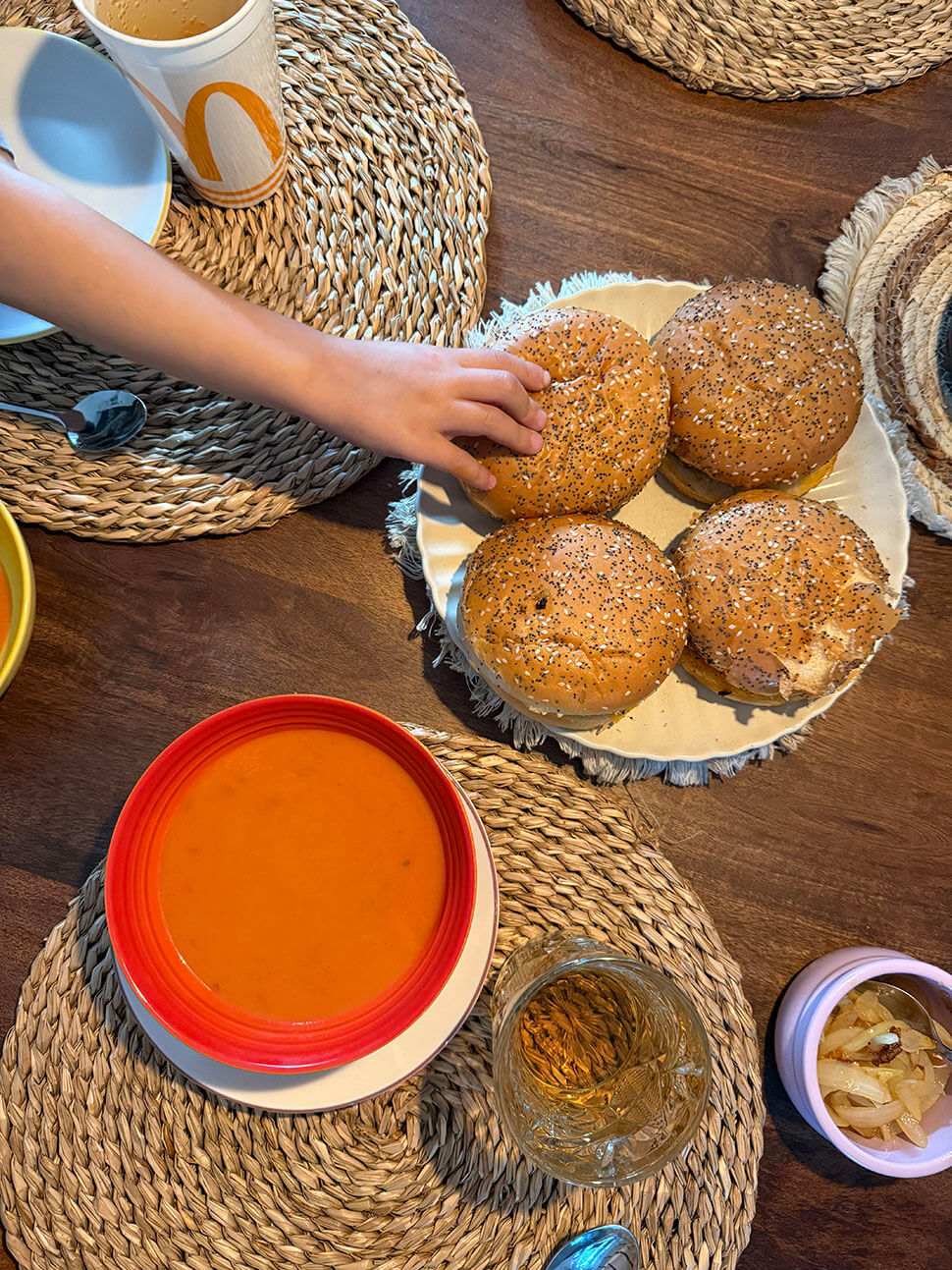 Vanaf maandag ging de beuk er vol in, er moest heel flink gekookt worden. Het meeste moest echter nog op de foto worden gezet dinsdag, dus het was alsnog een beetje improviseren. Ik deed de jongens een lol en maakte broodjes hamburger. Erbij aten we soep.