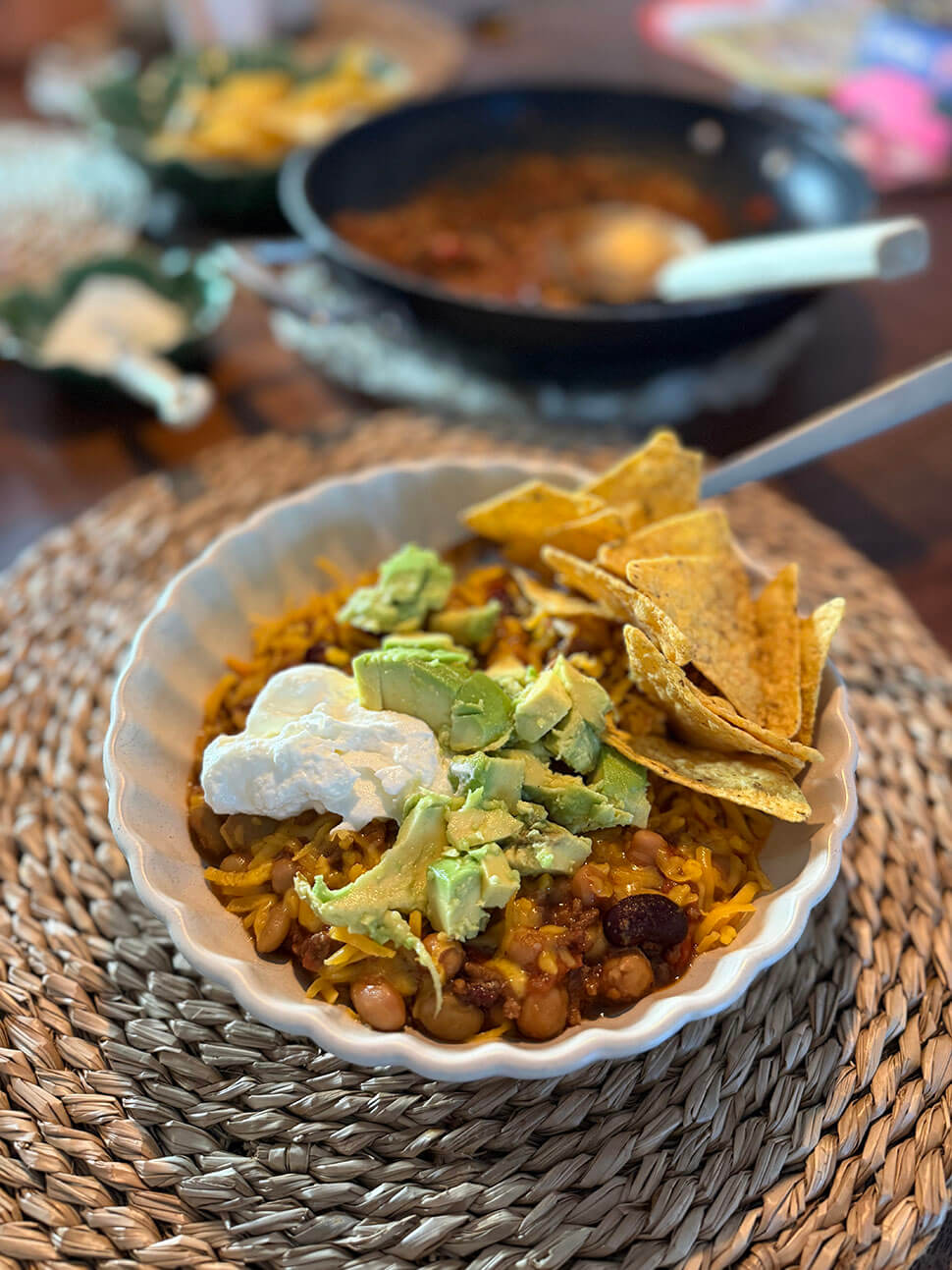 Dinsdag kwam er Texmex chili op tafel. Een goed gevulde schotel met gehakt en diverse bonen. Om het af te maken topten we het af met avocado, zure room en aten we er tortillachips bij.