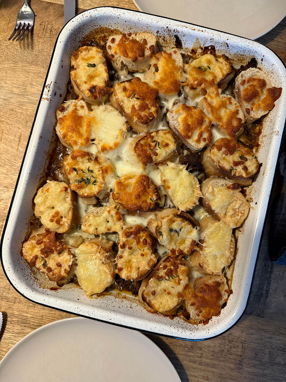Na een volle werkdag ging ik donderdag aan het eind van de middag weer padellen en daarna reed ik door naar mijn vriend. Het avondeten ging mee in de auto en schoven we daar weer even de oven in om op te warmen. Geniaal lekker gerecht is dit geworden: French Onion beef stew. Een soort mix tussen hachee en Franse uiensoep. Al zie je op de foto vooral de kaascroutons, er zat echt stoofvlees onder ;-)