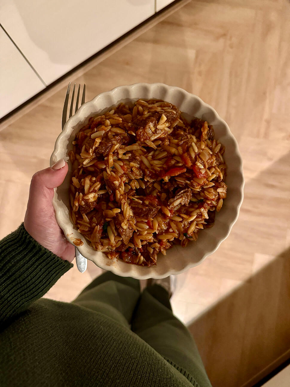 Er was een plotselinge verandering van de plannen woensdag. Normaliter zijn we allemaal vrij laat na de hockeytraining, maar die kwam te vervallen. Ik had dus iets meer tijd om te eten nadat ik de jongens naar hun vader had gebracht. Op dit recept moeten jullie nog even wachten, maar het is Griekse Giouvetsi. Een orzo gerecht met boterzacht stoofvlees – echt zó heerlijk.