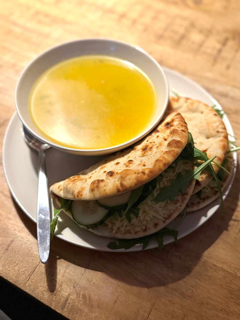Donderdagochtend is de man met de hamer langsgekomen. We (de liefde en ik) werden allebei knap beroerd wakker en gedurende de dag ging het eigenlijk van kwaad tot erger. Zin om te eten hadden we allebei niet zo, dus ik trok maar wat uit de kast. Een blik kippensoep (note to self: zorg voor een voorraad verse kippensoep in de vriezer voor zulke momenten) en flatbreads.