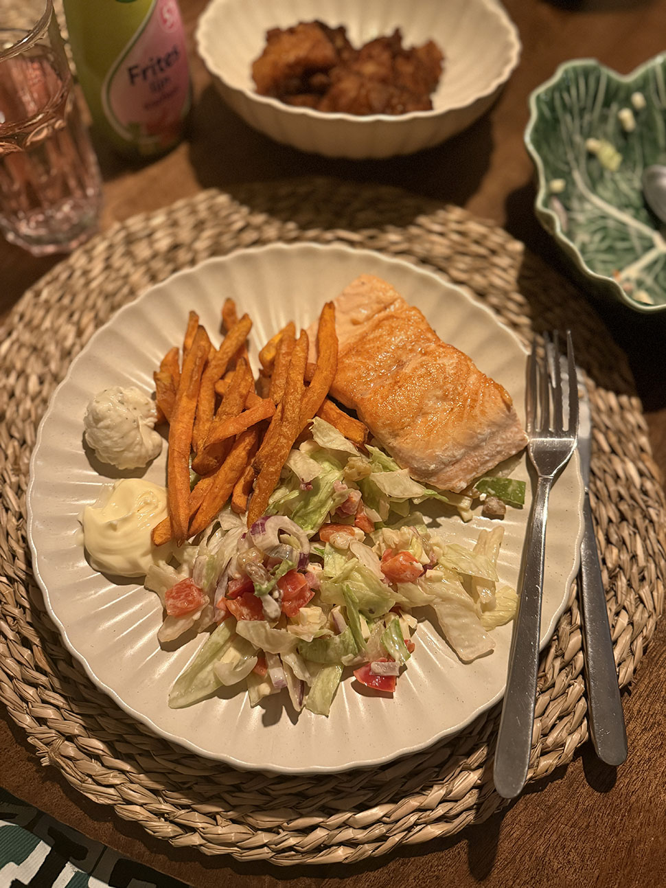 Na het werk racete ik nog even langs de supermarkt voor het avondeten. We gingen ’s avonds een Halloweentocht lopen dus het eten was vrij makkelijk: zoete aardappelfrietjes met zalm en een salade.