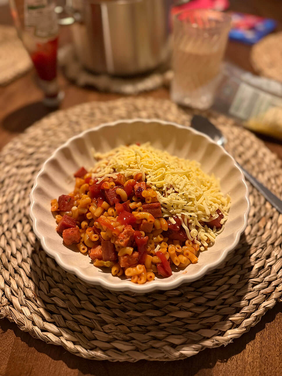 Maar maandag gingen we wel gewoon weer over naar de orde van de dag hoor. Hoewel, ik dook nog niet helemaal de keuken in en dus kozen de mini’s voor ‘macaroni met vierkante worstjes’ als avondeten. Prima, vind ik ook altijd erg lekker.