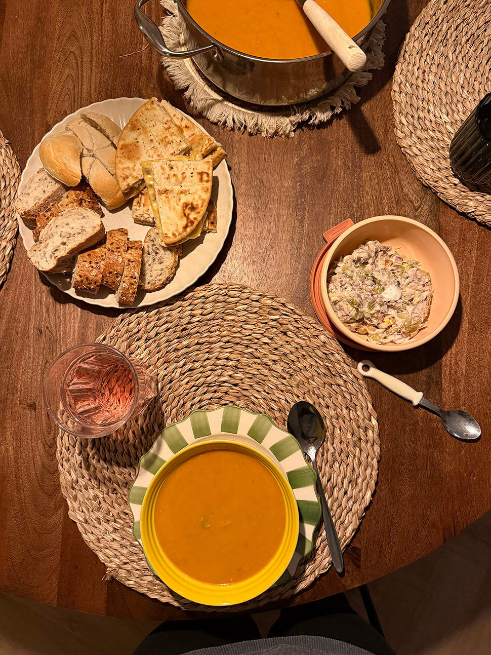 Vanaf dinsdag werd het allemaal iets ‘culinairder’ omdat we toen de gerechten die ik had gekookt konden opmaken. Op dinsdag was dit een super smaakvolle pompoen-wortelsoep (recept volgt) en erbij had ik allemaal broodrestjes om op te maken. Ik maakte tosti’s van Naan en had ook een lekkere zelfgemaakte gerookte makreelsalade op tafel staan.