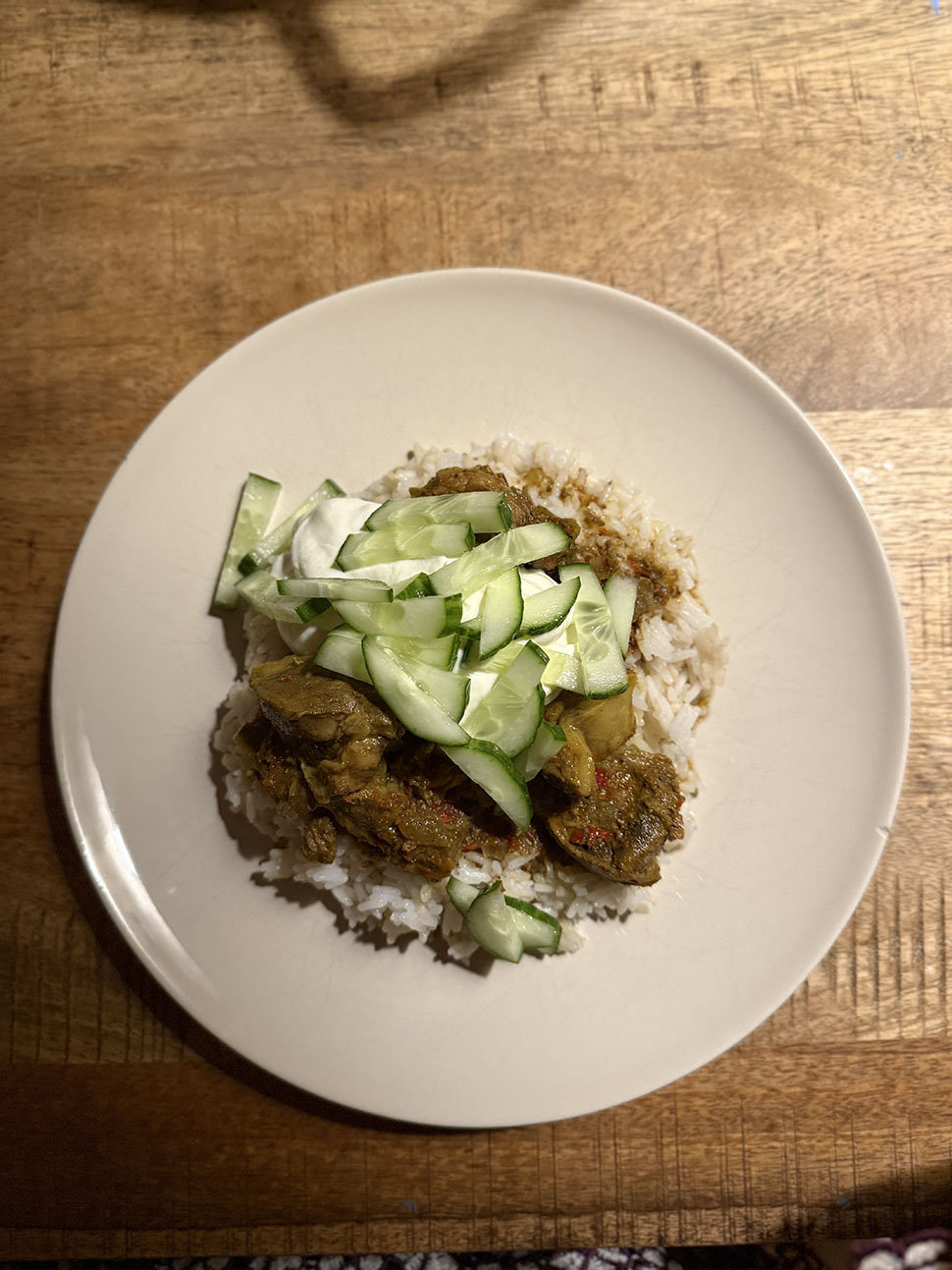 Wat ik ook nog meenam was een MEGA lekkere Lam Vindaloo. Een behoorlijk pittige lamscurry (maar oh zo smaakvol), die we aten met rijst, komkommer en een flinke lepel yoghurt om het pittige een beetje te blussen.