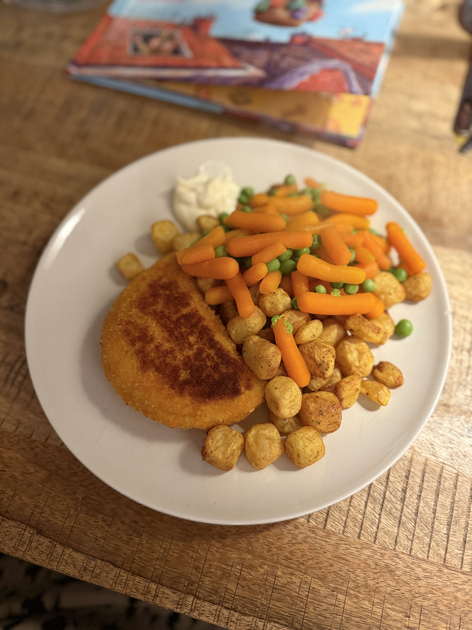 Een AGV’tje om de eetweek mee af te sluiten. Want soms moet je gewoon kiezen voor hetgeen de kinderen sowieso eten. Krieltjes uit de Airfryer, kip cordon bleu en doperwtjes met worteltjes. Primaaaa.