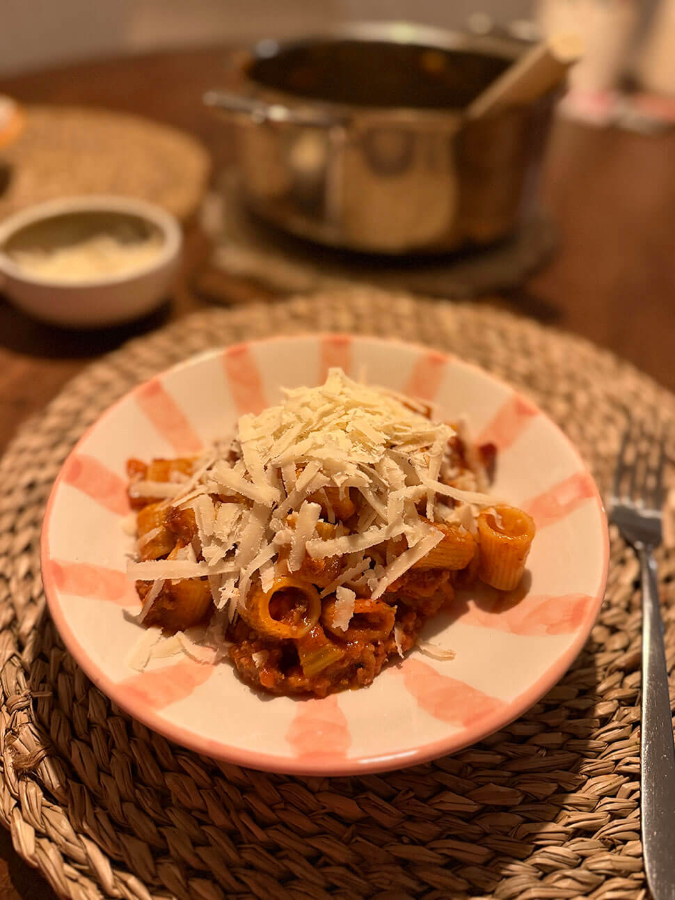 Van Euroma (het kruidenmerk) kreeg ik een pakket met allerlei verse ingrediënten voor zelfgemaakte bolognese. Aangezien ik nog niets had bedacht voor het avondeten van woensdag, zette ik ’s middags de bolognese al aan zodat die een paar uur kon pruttelen. Heerlijk was het!