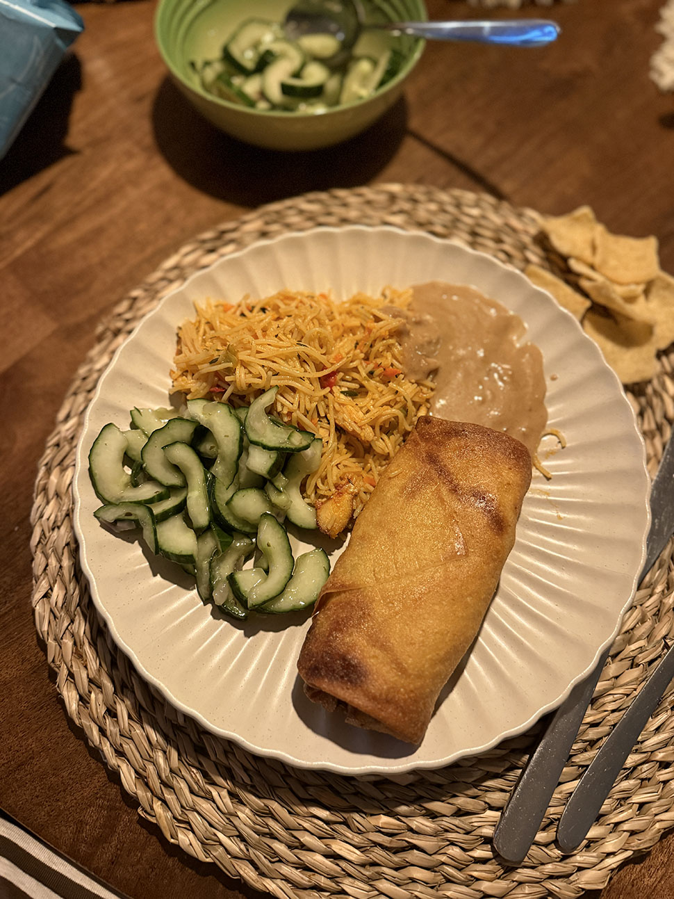 We moesten vrijdag wat inkopen doen en op het winkelcentrum waar we dat deden, zat een vestiging van Kippie. Aangezien we niet echt een idee hadden wat we wilden eten ’s avonds, besloten we daar wat mee te nemen. Het werd mihoen met komkommersalade en een loempia. Heeeerrrlijk om het weekend mee af te trappen.