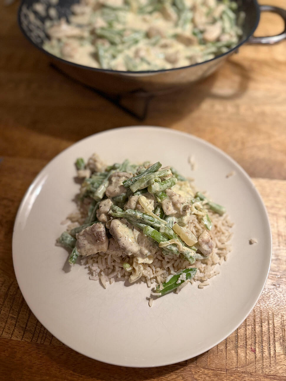 Mijn planning werd een beetje overhoop gegooid woensdag, dus in plaats van alleen te eten at ik alsnog met de liefde ’s avonds. In de supermarkt bedacht ik ter plekke wat er op tafel moest komen ’s avonds en dat werd uiteindelijk rijst met kippendijen en sperziebonen in een mosterd-roomsausje. Super snel klaar en altijd goed.