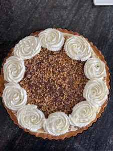 Als finishing touch wordt de vlaai vaak afgewerkt met chocolade, nougatine en mooie toefjes room langs de rand.